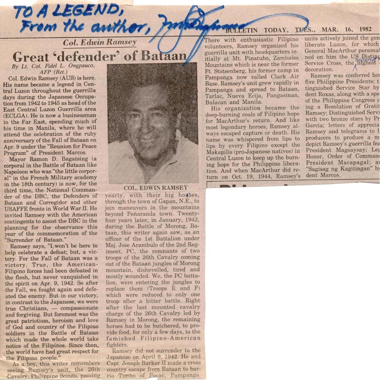 | R to L: Col. Robert Krueter, US Embassy; Col. Ruperto Kangleon, Sec Defense, Philippines and fmr CO Leyte Guerillas; Capt Ramona Synder, G-2 ECLGA; Ed Ramsey; Mrs. Betty Kreuter and House Spkr Eugenio Perez |